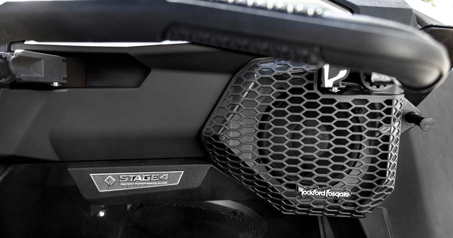 - Ab Werk abgestimmtes und integriertes Rockford Fosgate Stage 4 Audiosystem mit RIDE COMMAND-Headunit. Enthält: (2) 100-W-1"-Hochtöner, (2) 100-W-6,5"-Frontlautsprecher (Komponente), (2) 100-W-6,5"-Hecklautsprecher (Koaxial), (1) 400-W-4-Kanal-Verstärker und (1) 10"-Subwoofer mit integriertem 400-W-Subwoofer-Verstärker. *Audiosystem IPX7- und IPX9K-wassergetestet für extreme Bedingungen.