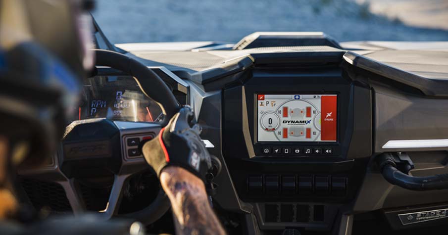 - Driver Forward Information Center mit 10,2 cm (4") Farbdisplay + Drehzahlmesser & Tacho, programmierbare Serviceintervalle, Tacho, Drehzahlmesser, Kilometerzähler, Tageskilometerzähler, Uhr, Betriebsstundenzähler, Ganganzeige, Tankanzeige, Kühlmitteltemperatur, Voltmeter, Serviceanzeige und -codes, Anschnall-Erinnerung, Ganganzeige, DC-Steckdose, Polaris P.A.S.S. Diebstahlschutzsystem